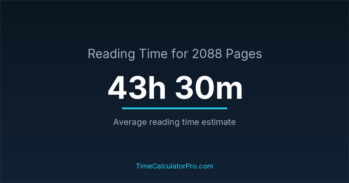If you read at an average speed of 200 words per minute, reading 2088 pages will take approximately 43 hours and 30 minutes. This estimate assumes around 250 words per page, which is typical for most books.
