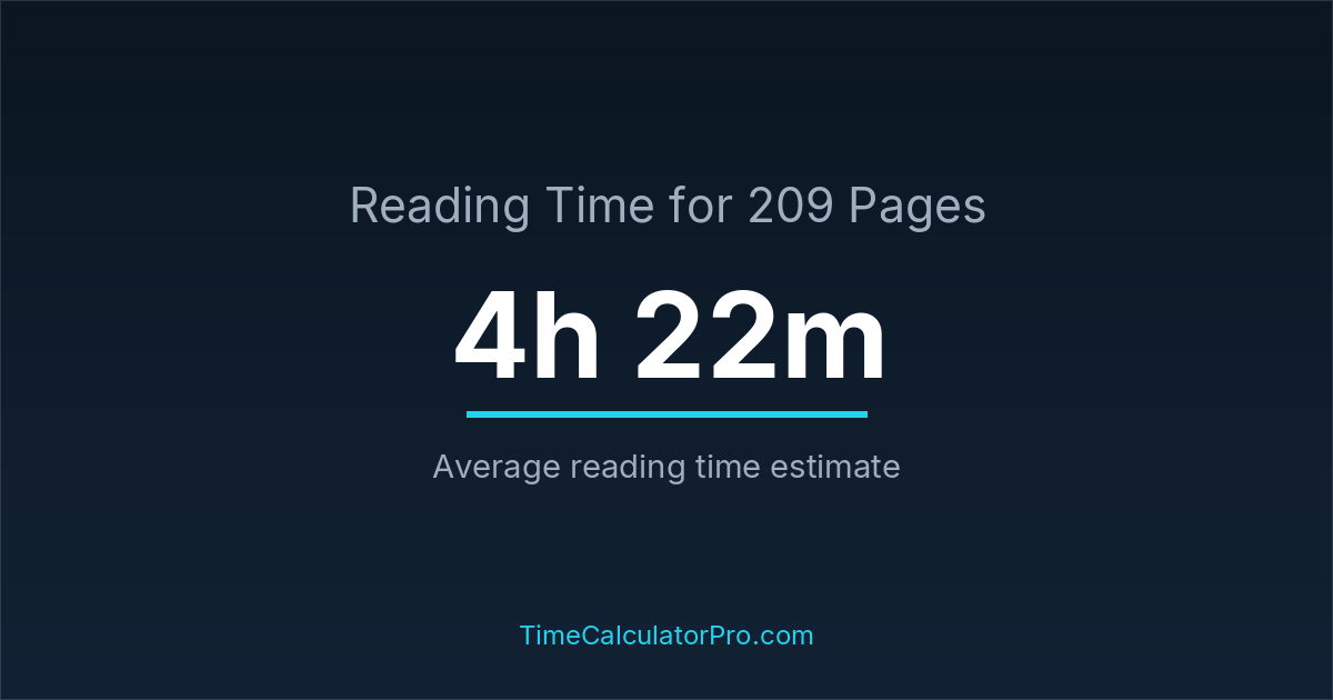 If you read at an average speed of 200 words per minute, reading 209 pages will take approximately 4 hours and 22 minutes. This estimate assumes around 250 words per page, which is typical for most books.