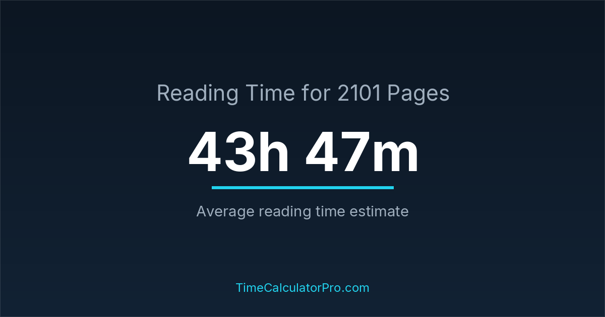 If you read at an average speed of 200 words per minute, reading 2101 pages will take approximately 43 hours and 47 minutes. This estimate assumes around 250 words per page, which is typical for most books.