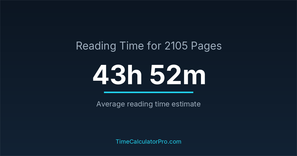 If you read at an average speed of 200 words per minute, reading 2105 pages will take approximately 43 hours and 52 minutes. This estimate assumes around 250 words per page, which is typical for most books.