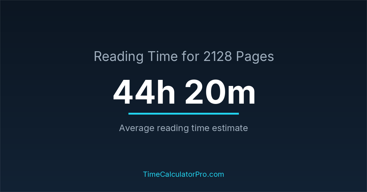 If you read at an average speed of 200 words per minute, reading 2128 pages will take approximately 44 hours and 20 minutes. This estimate assumes around 250 words per page, which is typical for most books.
