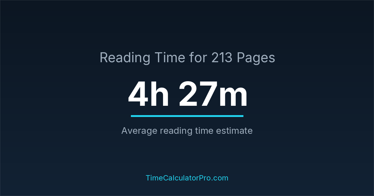 If you read at an average speed of 200 words per minute, reading 213 pages will take approximately 4 hours and 27 minutes. This estimate assumes around 250 words per page, which is typical for most books.