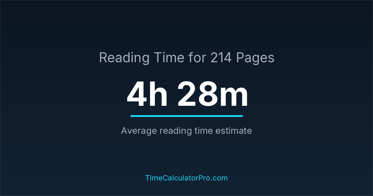 If you read at an average speed of 200 words per minute, reading 214 pages will take approximately 4 hours and 28 minutes. This estimate assumes around 250 words per page, which is typical for most books.