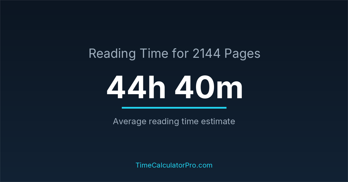 If you read at an average speed of 200 words per minute, reading 2144 pages will take approximately 44 hours and 40 minutes. This estimate assumes around 250 words per page, which is typical for most books.