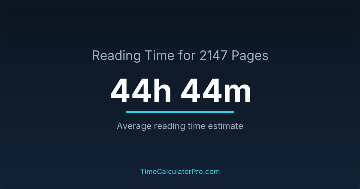 If you read at an average speed of 200 words per minute, reading 2147 pages will take approximately 44 hours and 44 minutes. This estimate assumes around 250 words per page, which is typical for most books.