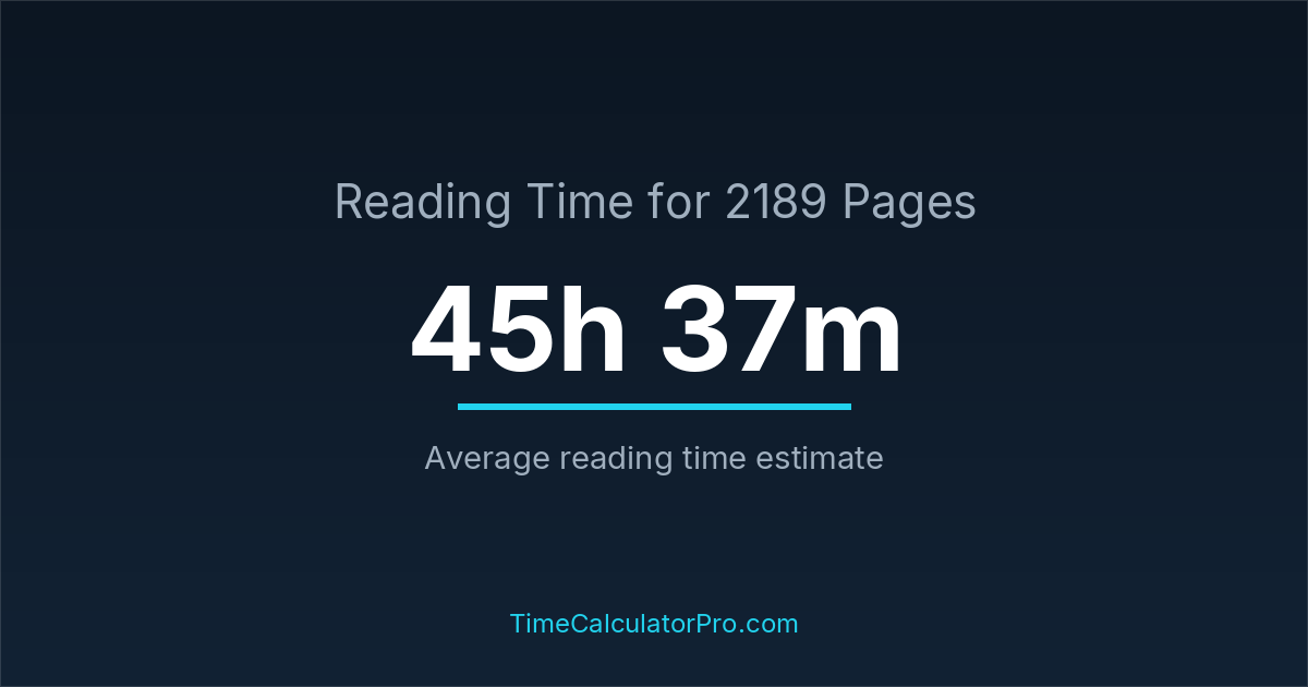 If you read at an average speed of 200 words per minute, reading 2189 pages will take approximately 45 hours and 37 minutes. This estimate assumes around 250 words per page, which is typical for most books.
