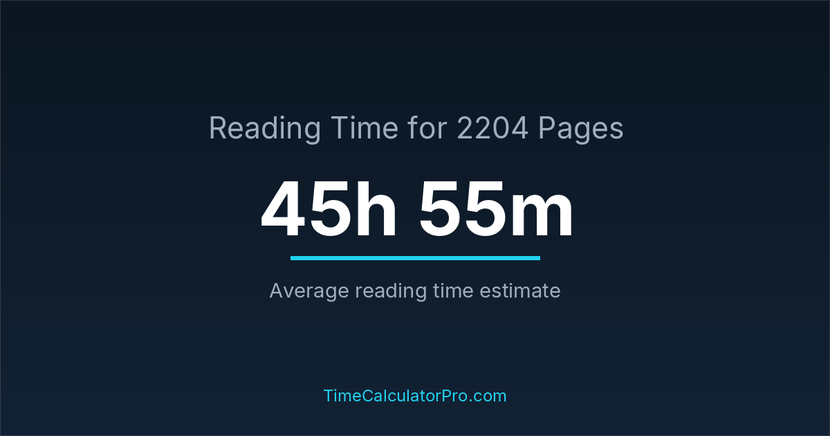 If you read at an average speed of 200 words per minute, reading 2204 pages will take approximately 45 hours and 55 minutes. This estimate assumes around 250 words per page, which is typical for most books.