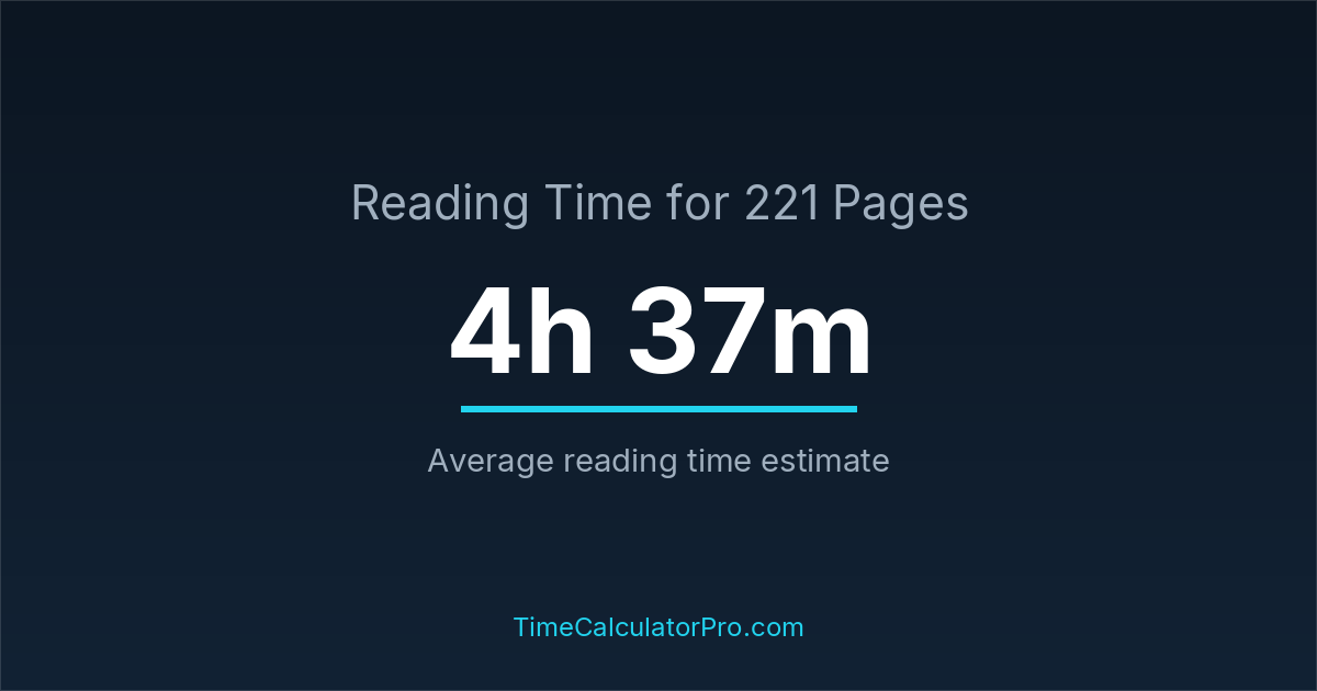 If you read at an average speed of 200 words per minute, reading 221 pages will take approximately 4 hours and 37 minutes. This estimate assumes around 250 words per page, which is typical for most books.