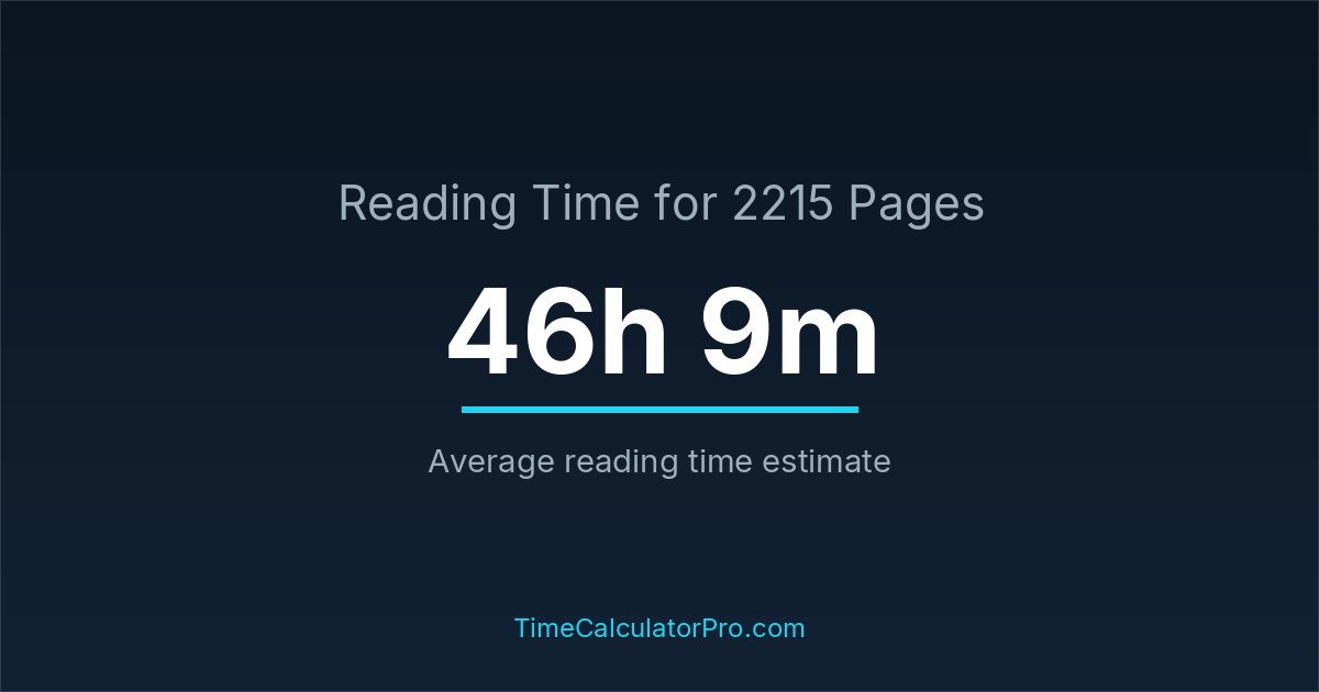 If you read at an average speed of 200 words per minute, reading 2215 pages will take approximately 46 hours and 9 minutes. This estimate assumes around 250 words per page, which is typical for most books.