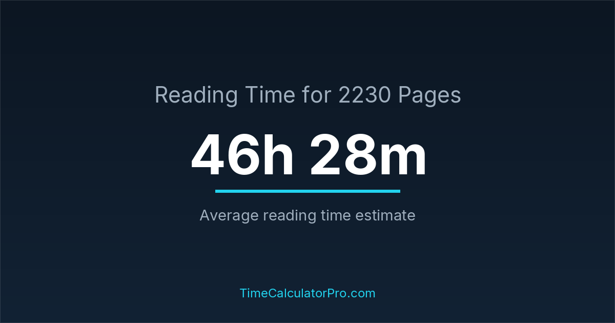If you read at an average speed of 200 words per minute, reading 2230 pages will take approximately 46 hours and 28 minutes. This estimate assumes around 250 words per page, which is typical for most books.
