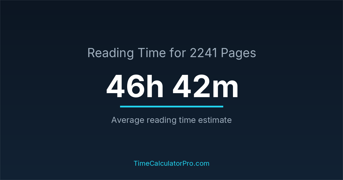 If you read at an average speed of 200 words per minute, reading 2241 pages will take approximately 46 hours and 42 minutes. This estimate assumes around 250 words per page, which is typical for most books.