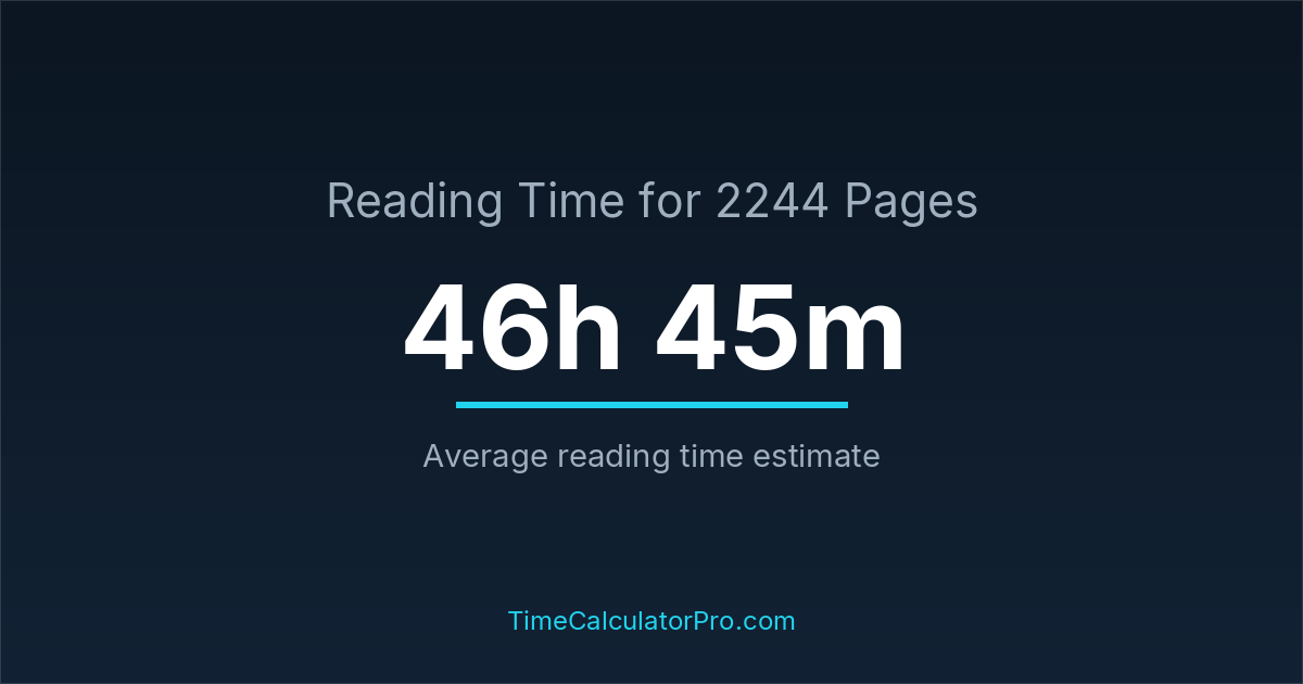 If you read at an average speed of 200 words per minute, reading 2244 pages will take approximately 46 hours and 45 minutes. This estimate assumes around 250 words per page, which is typical for most books.