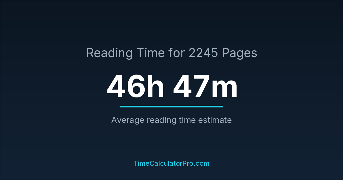 If you read at an average speed of 200 words per minute, reading 2245 pages will take approximately 46 hours and 47 minutes. This estimate assumes around 250 words per page, which is typical for most books.