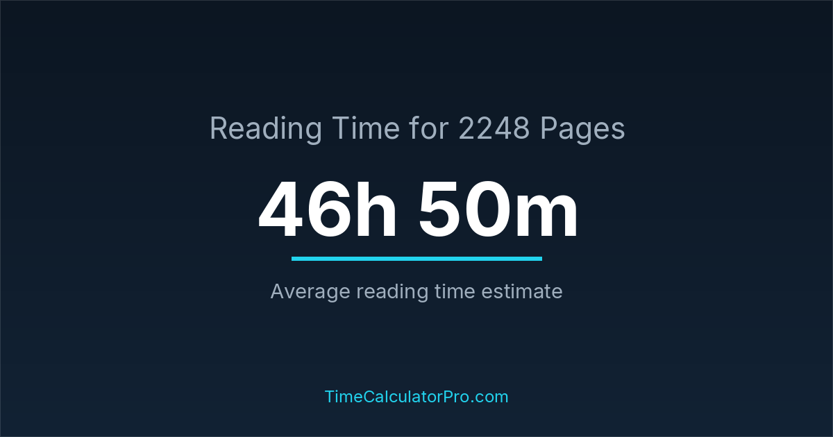 If you read at an average speed of 200 words per minute, reading 2248 pages will take approximately 46 hours and 50 minutes. This estimate assumes around 250 words per page, which is typical for most books.