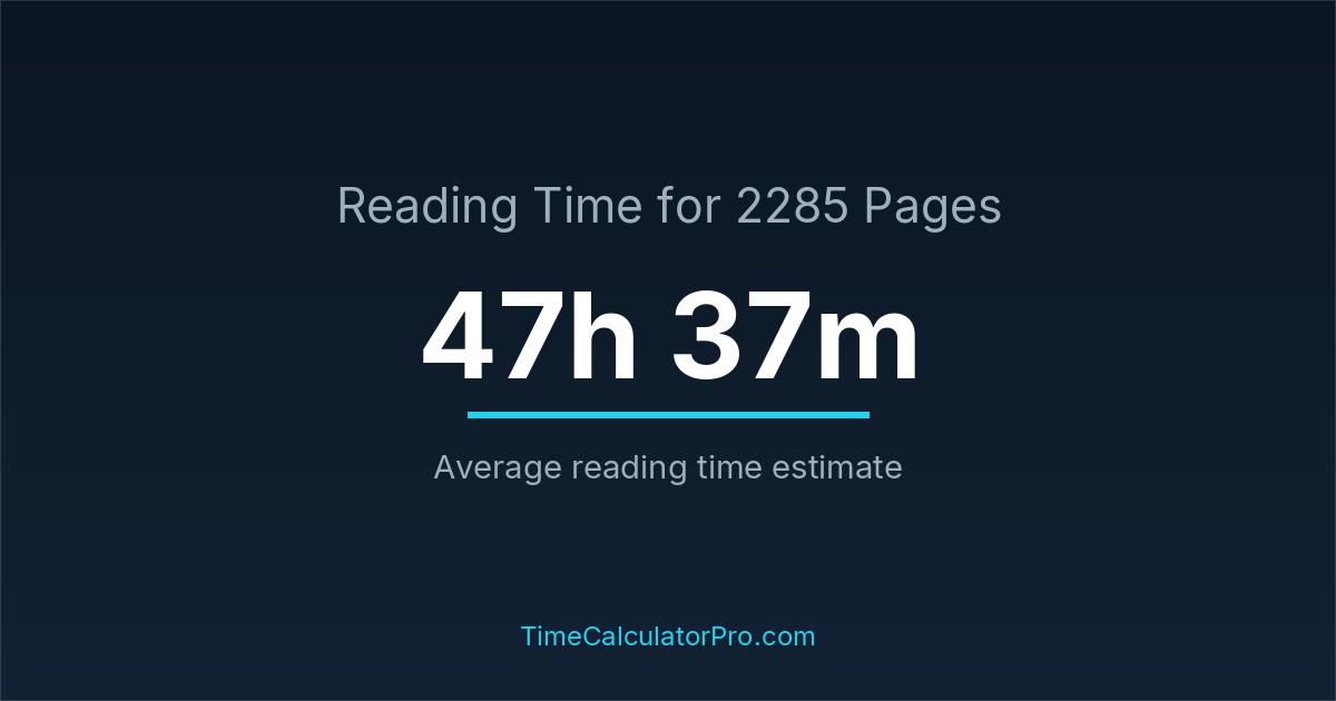 If you read at an average speed of 200 words per minute, reading 2285 pages will take approximately 47 hours and 37 minutes. This estimate assumes around 250 words per page, which is typical for most books.