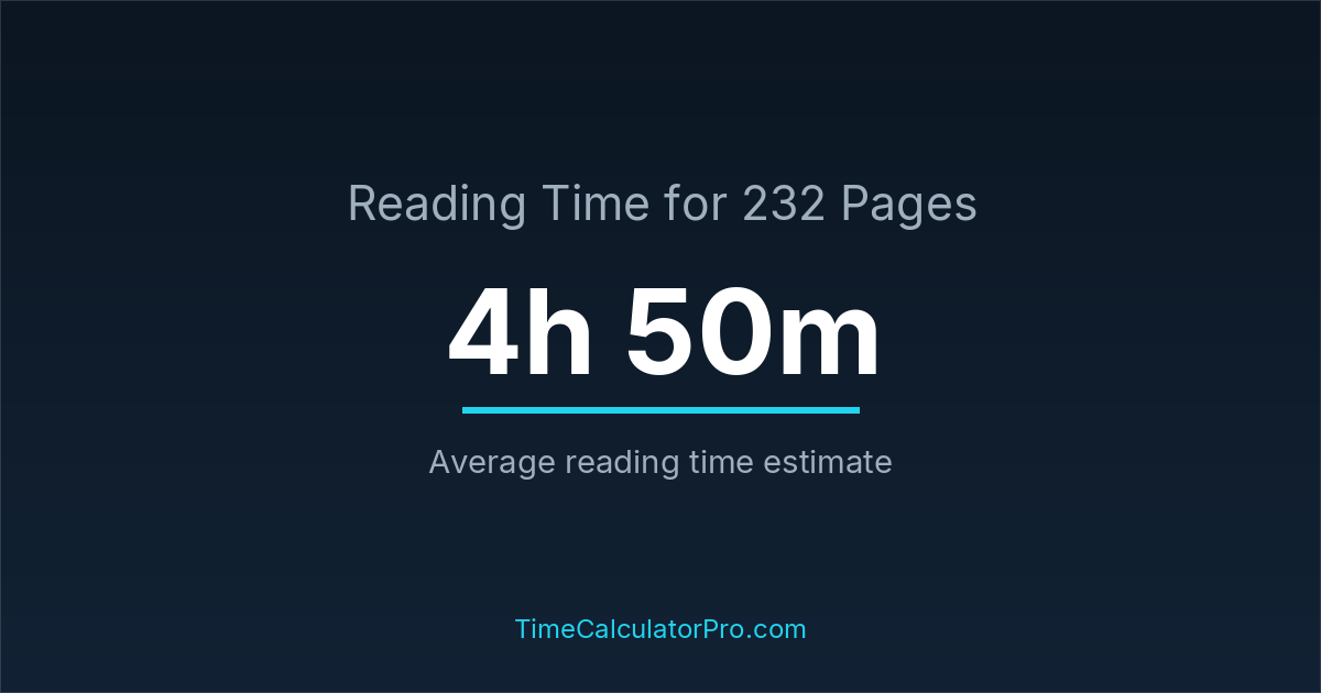 Reading 232 pages usually takes approximately 4 hours and 50 minutes for the average reader, though this can vary depending on concentration and reading habits.