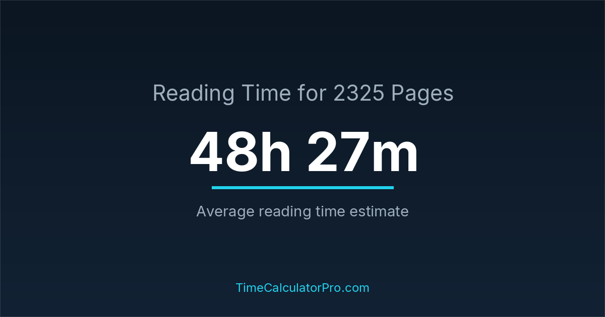 If you read at an average speed of 200 words per minute, reading 2325 pages will take approximately 48 hours and 27 minutes. This estimate assumes around 250 words per page, which is typical for most books.