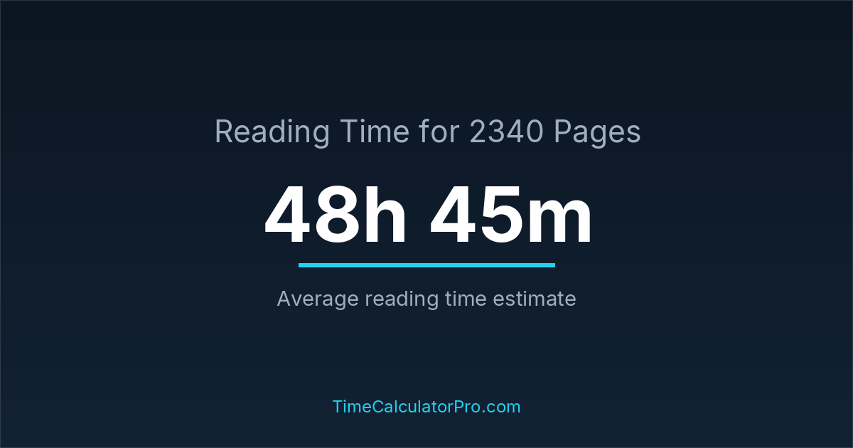 If you read at an average speed of 200 words per minute, reading 2340 pages will take approximately 48 hours and 45 minutes. This estimate assumes around 250 words per page, which is typical for most books.