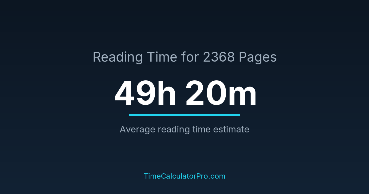 If you read at an average speed of 200 words per minute, reading 2368 pages will take approximately 49 hours and 20 minutes. This estimate assumes around 250 words per page, which is typical for most books.