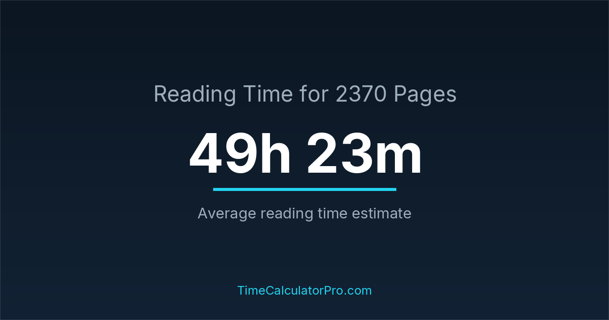 If you read at an average speed of 200 words per minute, reading 2370 pages will take approximately 49 hours and 23 minutes. This estimate assumes around 250 words per page, which is typical for most books.
