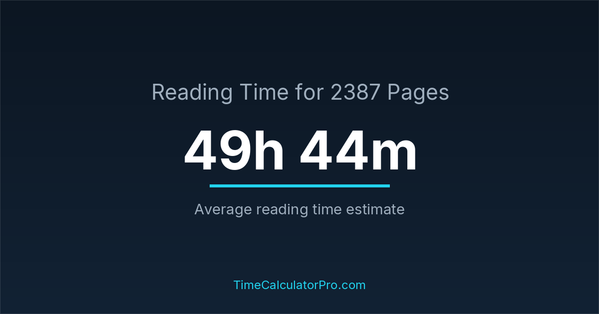 If you read at an average speed of 200 words per minute, reading 2387 pages will take approximately 49 hours and 44 minutes. This estimate assumes around 250 words per page, which is typical for most books.