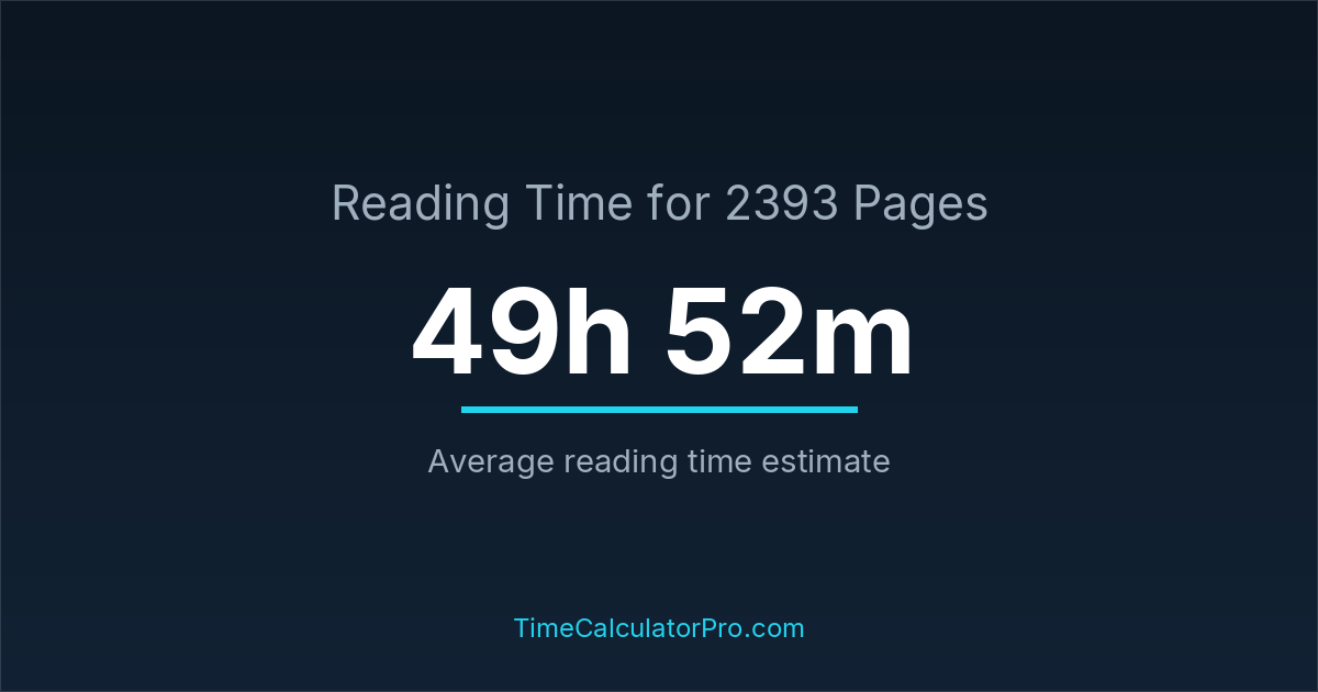 If you read at an average speed of 200 words per minute, reading 2393 pages will take approximately 49 hours and 52 minutes. This estimate assumes around 250 words per page, which is typical for most books.