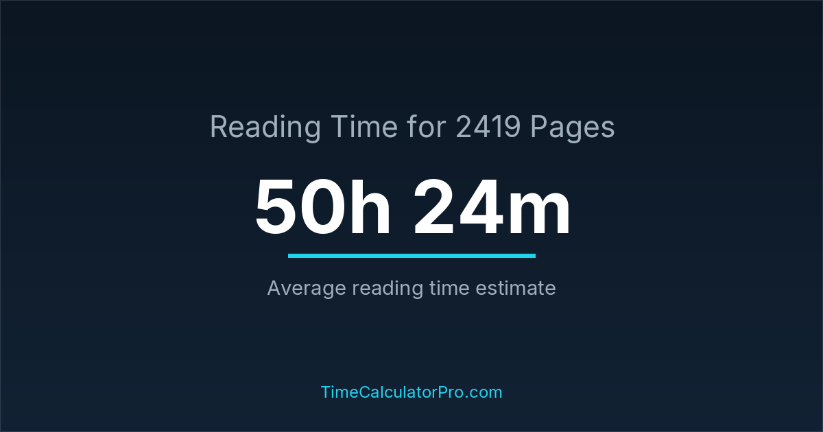 If you read at an average speed of 200 words per minute, reading 2419 pages will take approximately 50 hours and 24 minutes. This estimate assumes around 250 words per page, which is typical for most books.
