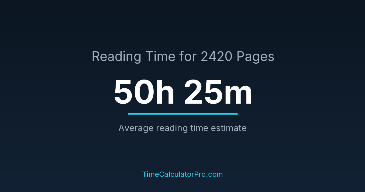 If you read at an average speed of 200 words per minute, reading 2420 pages will take approximately 50 hours and 25 minutes. This estimate assumes around 250 words per page, which is typical for most books.