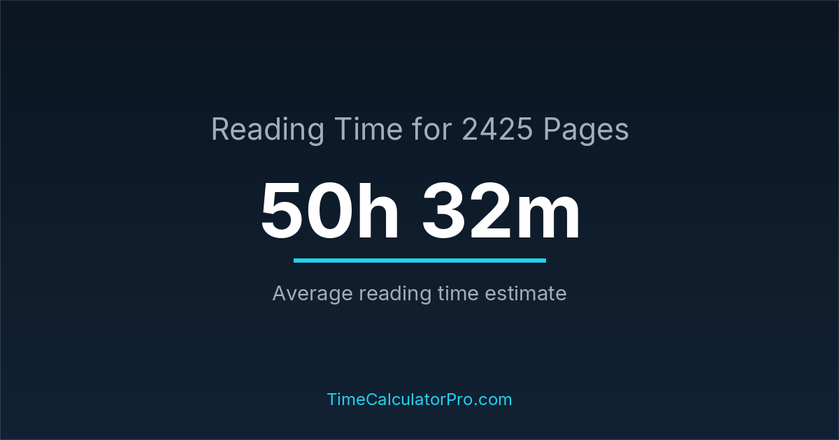 If you read at an average speed of 200 words per minute, reading 2425 pages will take approximately 50 hours and 32 minutes. This estimate assumes around 250 words per page, which is typical for most books.