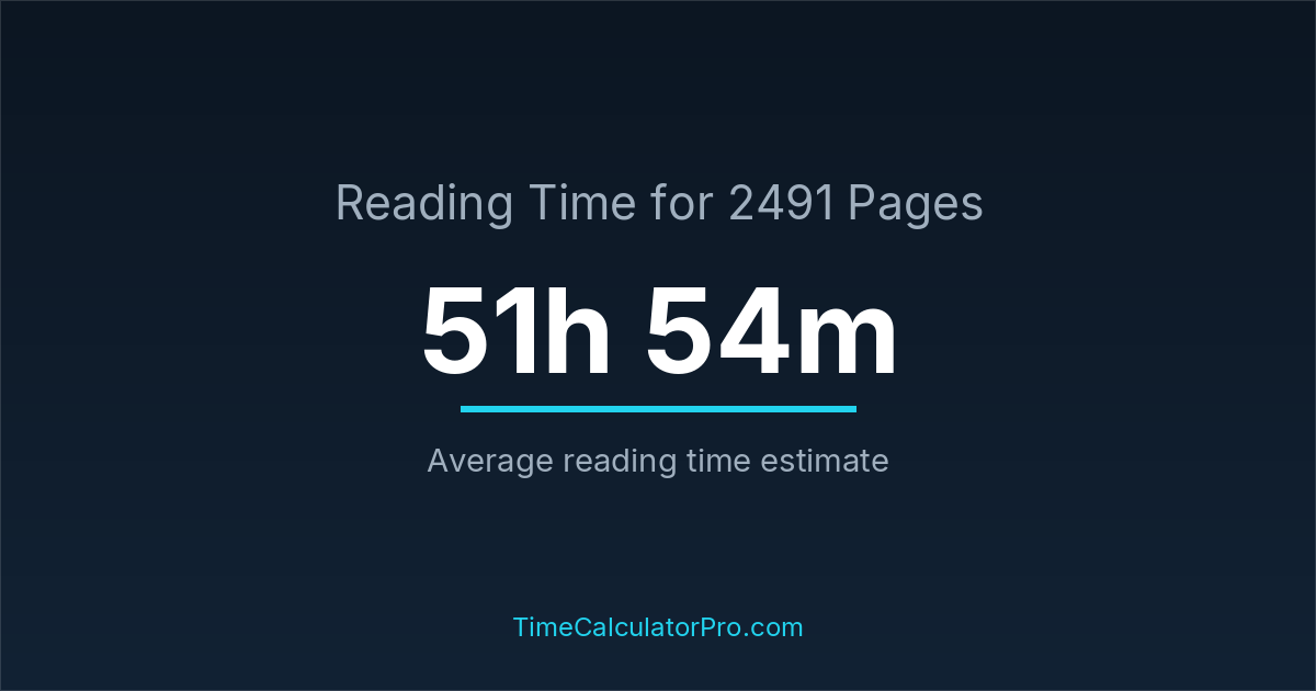 If you read at an average speed of 200 words per minute, reading 2491 pages will take approximately 51 hours and 54 minutes. This estimate assumes around 250 words per page, which is typical for most books.