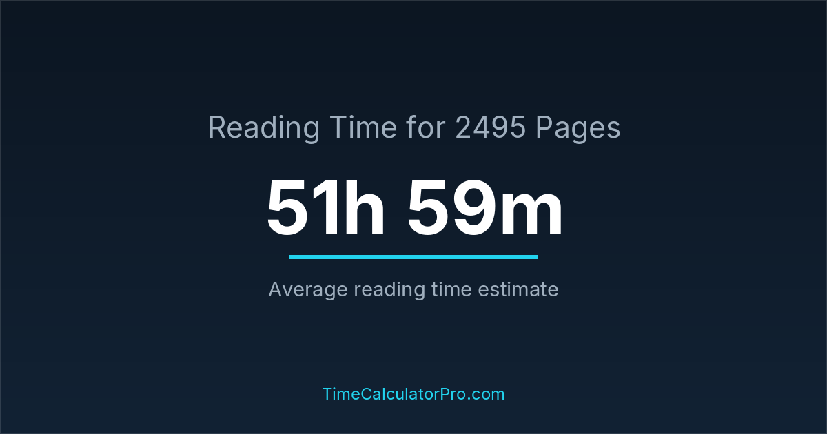 If you read at an average speed of 200 words per minute, reading 2495 pages will take approximately 51 hours and 59 minutes. This estimate assumes around 250 words per page, which is typical for most books.