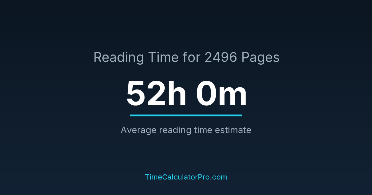Estimating how long it takes to read 2496 pages can help you plan your reading schedule, with an average time of 52 hours and 0 minutes.