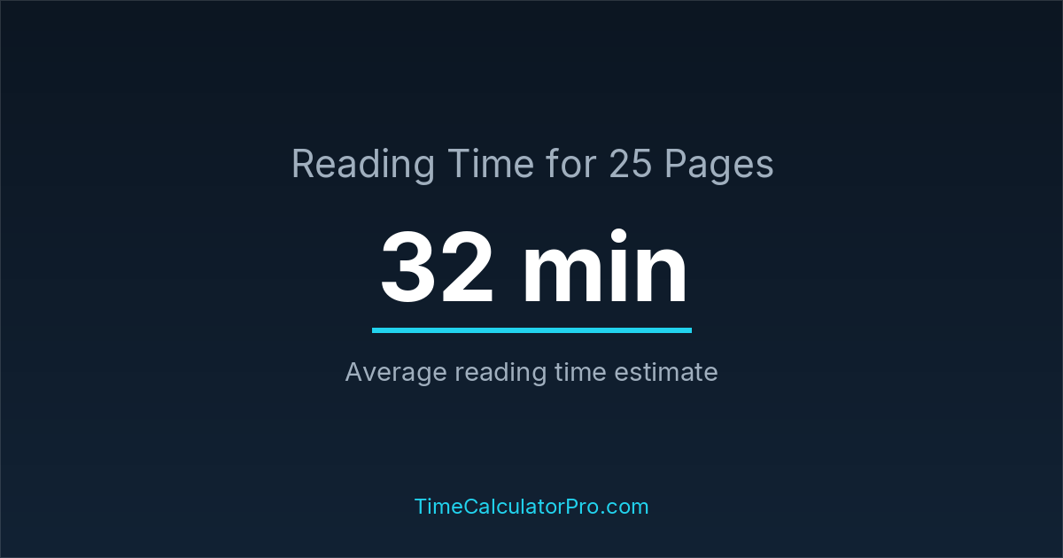 If you read at an average speed of 200 words per minute, reading 25 pages will take approximately 0 hours and 32 minutes. This estimate assumes around 250 words per page, which is typical for most books.