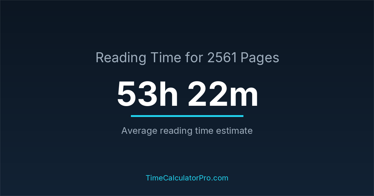 If you read at an average speed of 200 words per minute, reading 2561 pages will take approximately 53 hours and 22 minutes. This estimate assumes around 250 words per page, which is typical for most books.