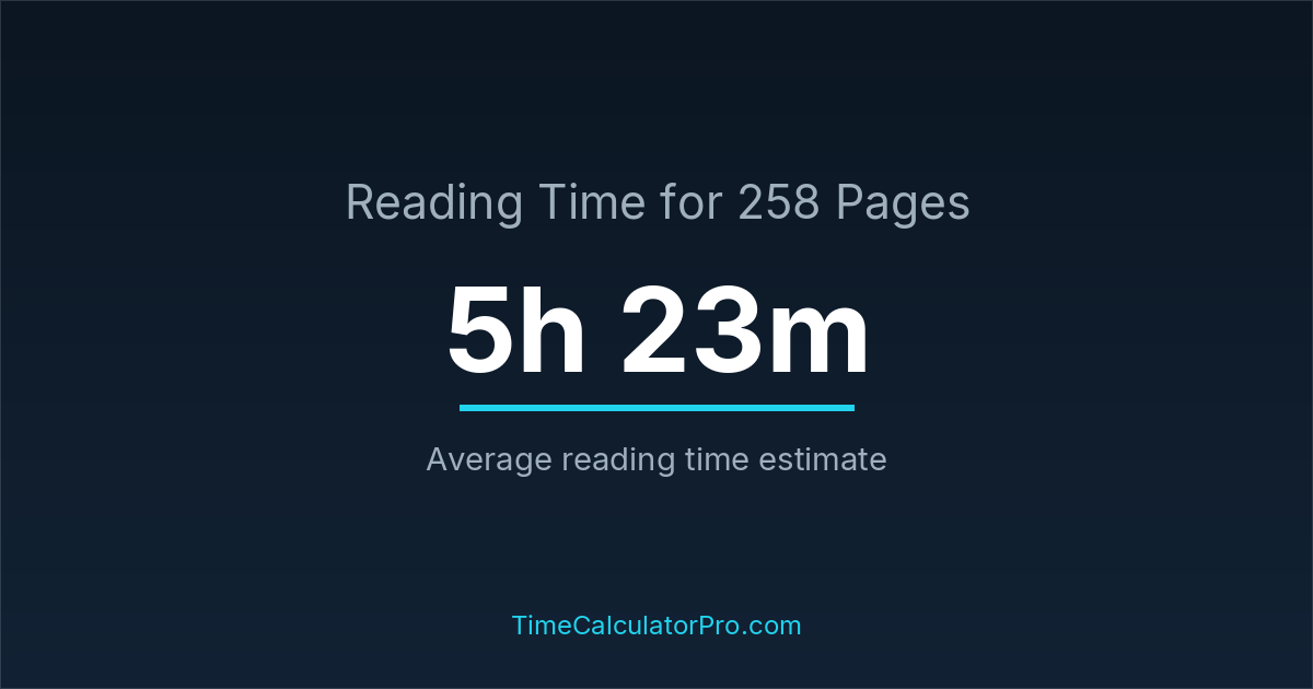 Using a reading time calculator, you can estimate that 258 pages will take around 5 hours and 23 minutes to complete.