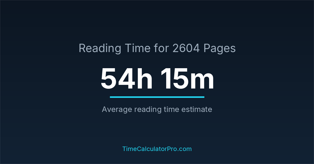On average, reading 2604 pages may require about 54 hours and 15 minutes for most readers, assuming a standard reading pace and moderate difficulty.