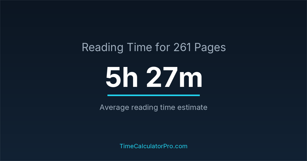 If you are wondering how long it takes to read 261 pages, the estimated reading time is roughly 5 hours and 27 minutes based on common reading speed averages.