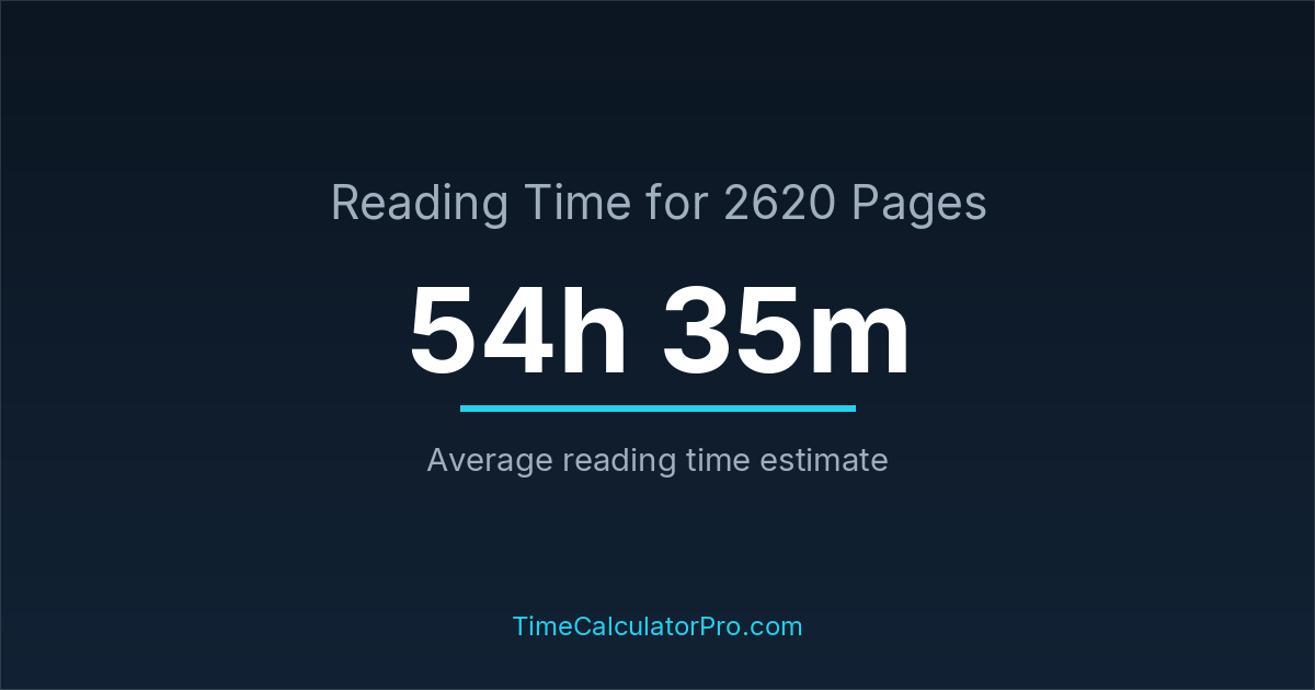 If you read at an average speed of 200 words per minute, reading 2620 pages will take approximately 54 hours and 35 minutes. This estimate assumes around 250 words per page, which is typical for most books.
