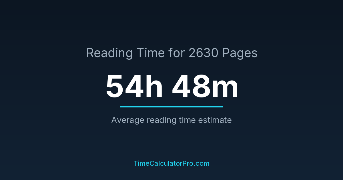 If you read at an average speed of 200 words per minute, reading 2630 pages will take approximately 54 hours and 48 minutes. This estimate assumes around 250 words per page, which is typical for most books.