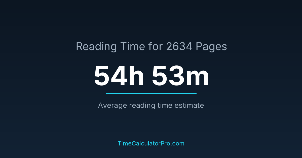 If you read at an average speed of 200 words per minute, reading 2634 pages will take approximately 54 hours and 53 minutes. This estimate assumes around 250 words per page, which is typical for most books.