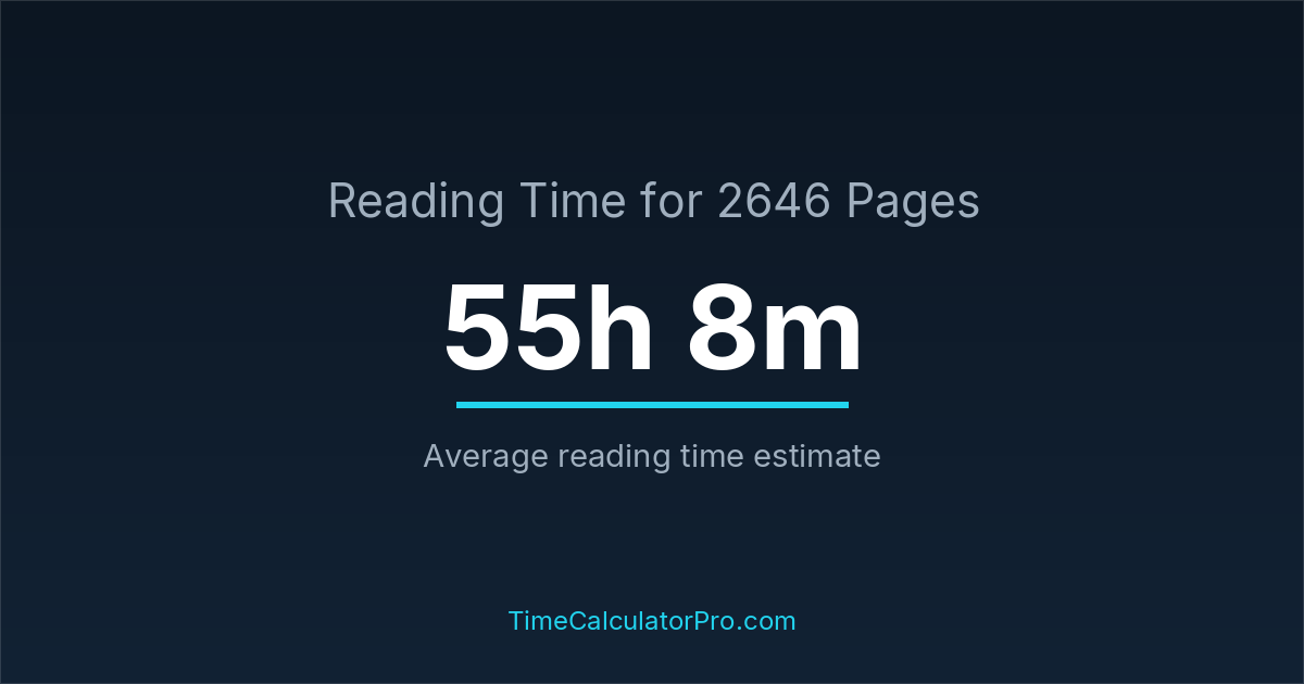 If you read at an average speed of 200 words per minute, reading 2646 pages will take approximately 55 hours and 8 minutes. This estimate assumes around 250 words per page, which is typical for most books.