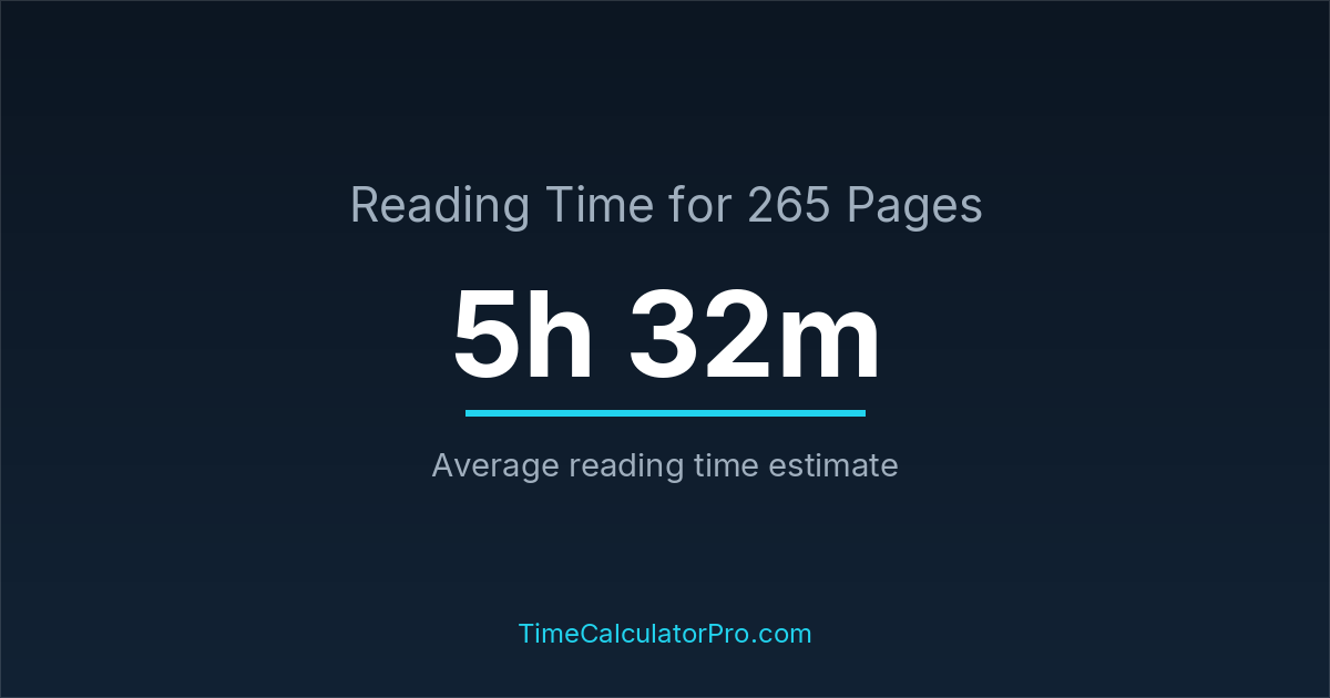 If you read at an average speed of 200 words per minute, reading 265 pages will take approximately 5 hours and 32 minutes. This estimate assumes around 250 words per page, which is typical for most books.