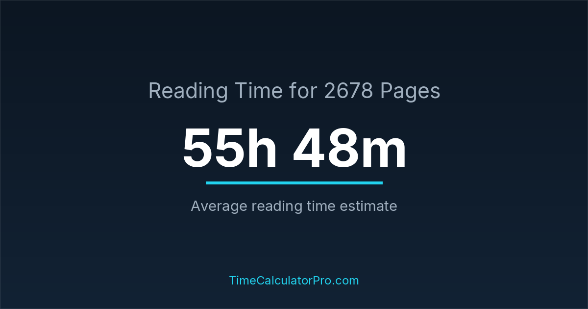 If you read at an average speed of 200 words per minute, reading 2678 pages will take approximately 55 hours and 48 minutes. This estimate assumes around 250 words per page, which is typical for most books.