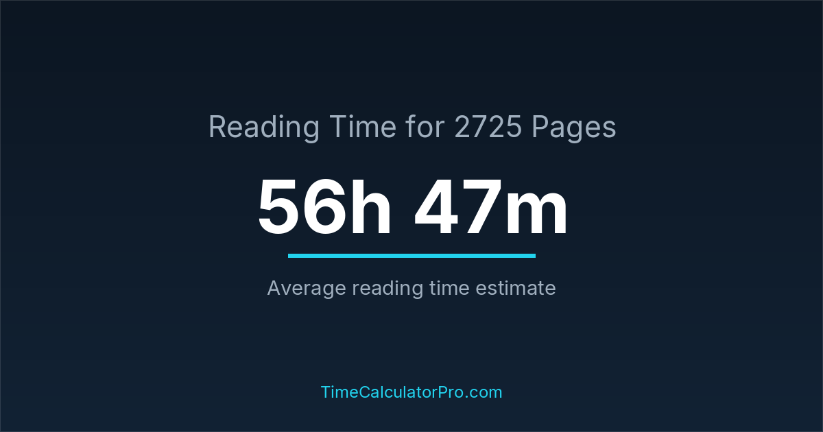 If you read at an average speed of 200 words per minute, reading 2725 pages will take approximately 56 hours and 47 minutes. This estimate assumes around 250 words per page, which is typical for most books.