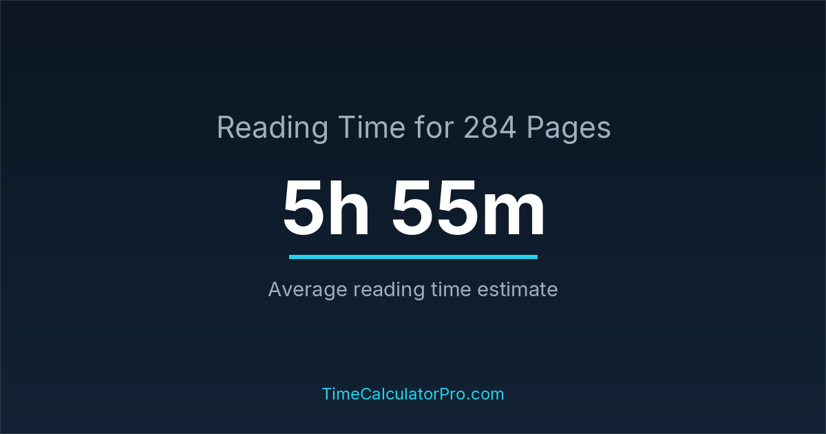 If you read at an average speed of 200 words per minute, reading 284 pages will take approximately 5 hours and 55 minutes. This estimate assumes around 250 words per page, which is typical for most books.