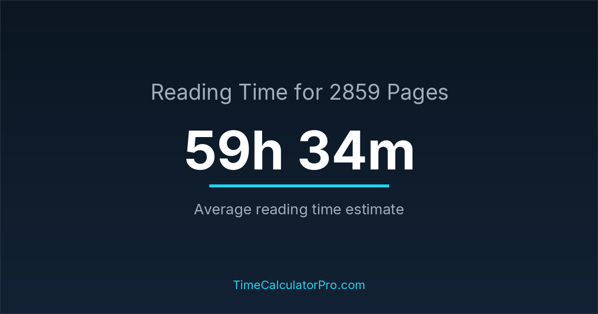 If you read at an average speed of 200 words per minute, reading 2859 pages will take approximately 59 hours and 34 minutes. This estimate assumes around 250 words per page, which is typical for most books.