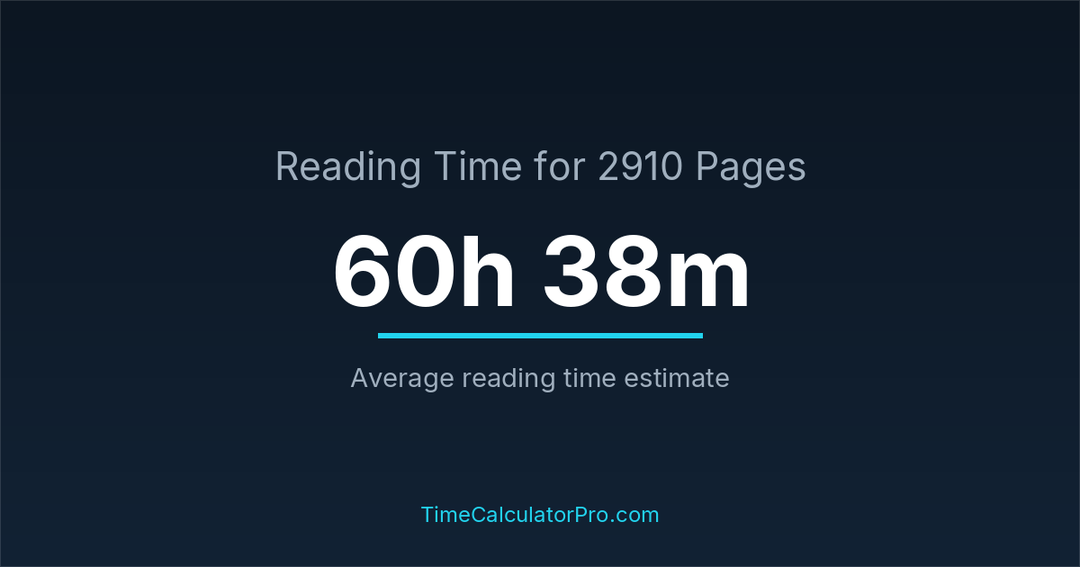 If you read at an average speed of 200 words per minute, reading 2910 pages will take approximately 60 hours and 38 minutes. This estimate assumes around 250 words per page, which is typical for most books.