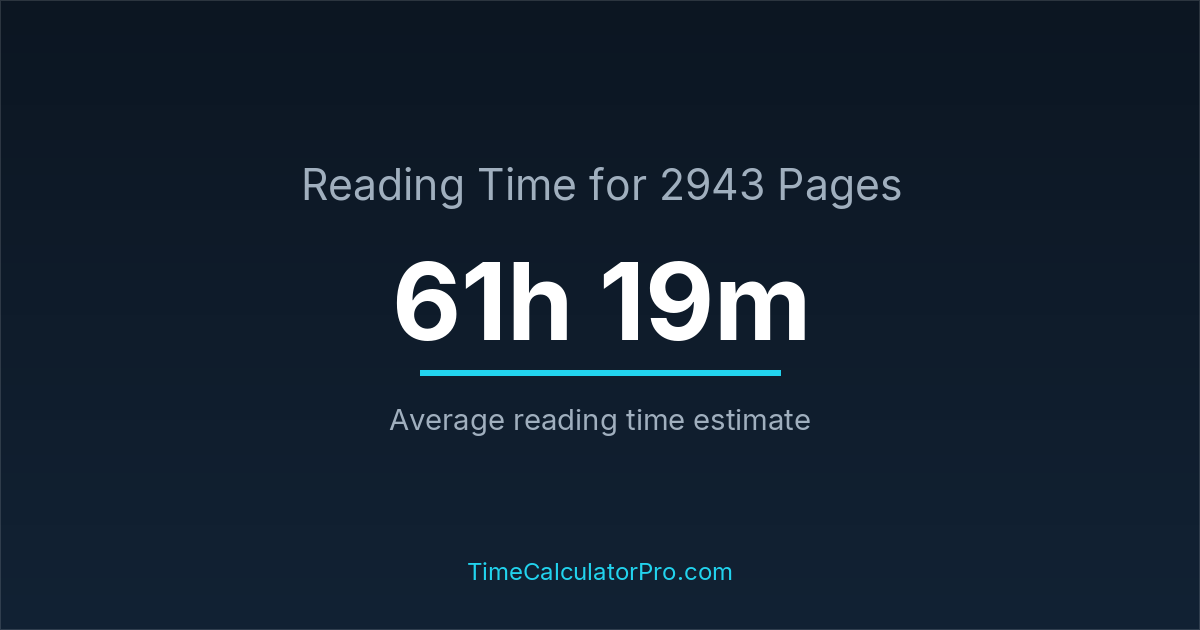 If you read at an average speed of 200 words per minute, reading 2943 pages will take approximately 61 hours and 19 minutes. This estimate assumes around 250 words per page, which is typical for most books.