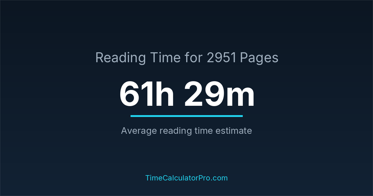 If you read at an average speed of 200 words per minute, reading 2951 pages will take approximately 61 hours and 29 minutes. This estimate assumes around 250 words per page, which is typical for most books.