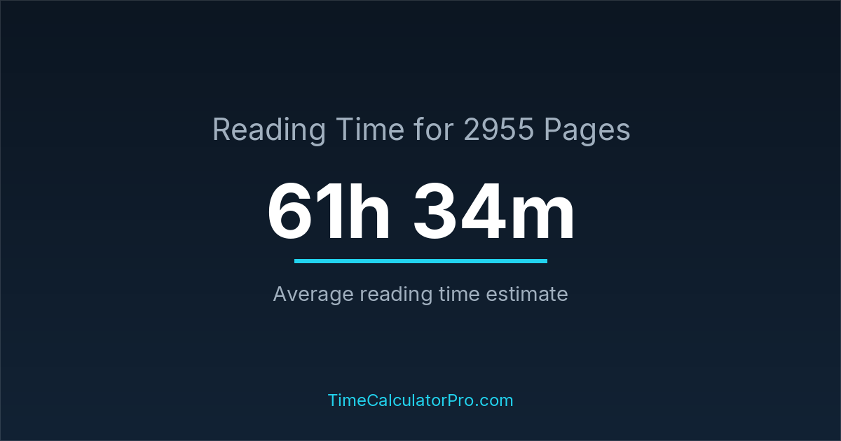 If you read at an average speed of 200 words per minute, reading 2955 pages will take approximately 61 hours and 34 minutes. This estimate assumes around 250 words per page, which is typical for most books.